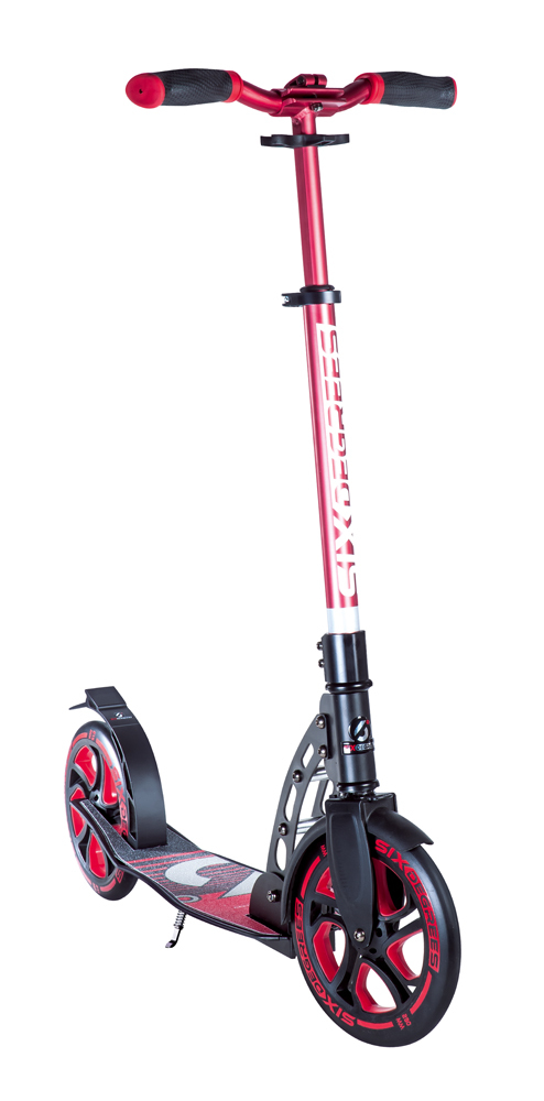 Vysoce kvalitní a plně hliníková skládací koloběžka Six Degrees v červeném provedení. Koloběžka je vybavena jednoduchým skládacím mechanismem. Výškově nastavitelná řídítka 81,5-105,5 cm jsou extra široká ve stylu MBX s rukojeťmi TPR. Rychloupínací svorka na T-rámu pro pevné uchycení řídítek. XL stupátko s vyztuženými hranami a rozměrem 575 x 150 mm. Extra silná třecí brzda s protiskluzovým povrchem. Přední a zadní kolo s blatníkem. Přední kolo 230 mm s dvojitými ráfky, zadní kolo 215 mm. Ložiska ABEC 7. Bezpečnostní odrazky vpředu i vzadu. Stojánek. Maximální nosnost: 100 kg. Rozměr rozložené koloběžky: 105,5 x 34,5 x 93,5 cm. Rozměr složené koloběžky: 83 x 15 x 34 cm. Věk: 3+