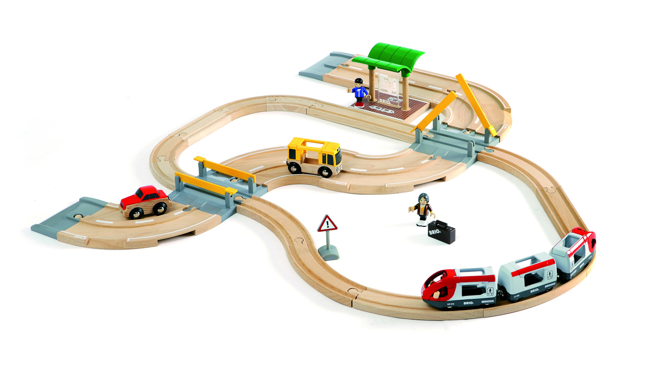 Dřevěná vláčkodráha s osobním vlakem a silnicí s autíčky. Součástí je i autobusová stanice a závory. Sada obsahuje 33 dílů