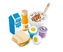 - Obsah sady: jogurt, mléko, pomerančový džus, vejce s kalíškem, sendvič, miska ovesných vloček s dřevěnou lžící.