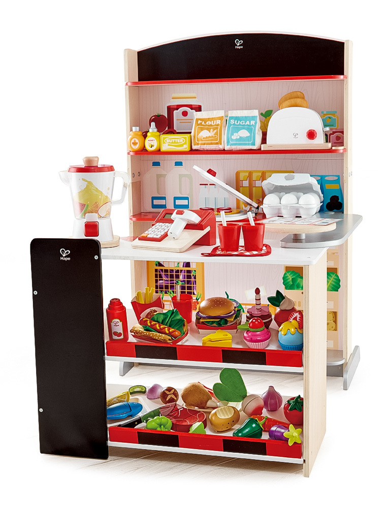 Nádherný dětský obchod s pokladnou a pultem je vyrobený ze dřeva a má všechny důležité doplňky pro hru na prodavače(prodavačku). Svou velikostí je ideálně uzpůsobený výšce dětí. Hračka rozvíjí kreativitu u dětí. V obchodě naleznete velký regál na prodávané zboží, prodejní pult s poličkami na zboží, tabulí, kde křídou můžete zapsat akční ceny a nabídky, pokladnu se skenerem, platebním terminálem a platební kartou. Pokladna vydává zvuk a skener se při snímání kódu rozsvítí. Vyrobeno z kvalitního a