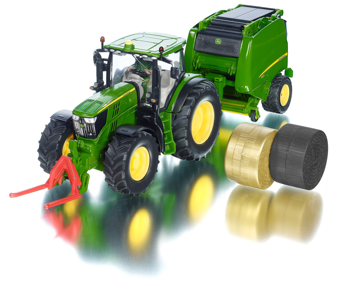 Rozšiřte svou sbírku zemědělských strojů o tento zelený SIKU Farmer - Traktor John Deere s balíkovačkou. Jedná se o model traktoru John Deere 6920R vyrobený z kovu s plastovými detaily v měřítku 1:32. K traktoru lze připojit veškeré příslušenství v daném měřítku. Kapota motoru je otevíratelná a do kabinky traktoru lze umístit figurku řidiče. Vpředu naleznete přední závěs pro zapojení čelního příslušenství. Rozměr: 182 x 90 x 109 mm. SIKU balíkovačka John Deere 990 je vyrobena společností SIKU jako vysoce kvalitní model v měřítku 1:32 s originálními detaily. Podvozek s jednou nápravou má originální detailní pneumatiky a ráfky kol. S otevřenými bočními klapkami na jednotce a zadní branou, s volným výhledem na plně detailní interiér. Sběrací a opěrná noha je pohyblivá a vylepšuje výjimečný vzhled tohoto modelu spolu s vysoce kvalitní lakovou prací a nápisem. Jako příslušenství se dodává jeden kulatý balík. Rozměr: 173 x 91 x 95 mm. Rozměr balení: 42 x 16 x 9,8 cm. Věk: 3+