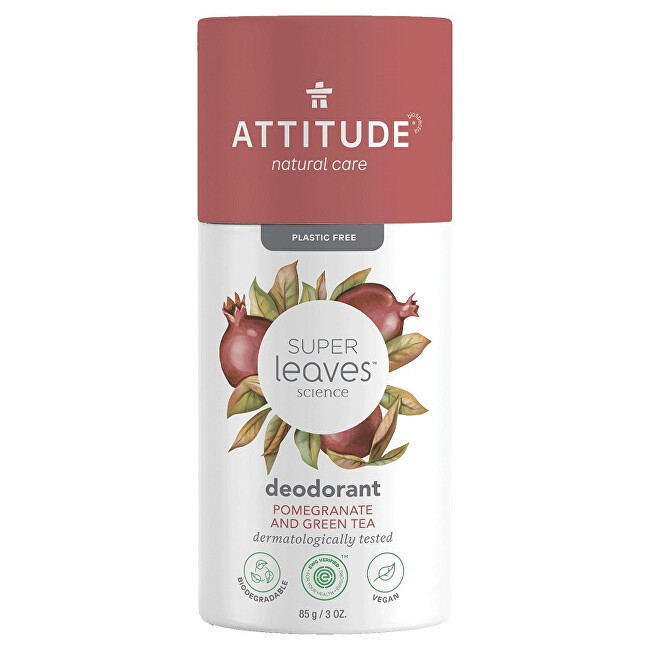 Přírodní deodorant skutečně funguje. Dopřejte svému tělu ochranu před pocením, která neškodí vašemu organismu a obsahuje jen ty nejlepší naturální složky. Deodorant má navíc kompletně bezplastový obal, takže zbytečně nezatěžuje životní prostředí a je zcela rozložitelný. 100% bezpečný, šetrný a spolehlivý parťák pro každý den. Místo hliníku, běžně využívaného k zabránění pocení u klasických přípravků, obsahují deodoranty kukuřičný škrob s absorpčními vlastnostmi a kořenový škrob z Maranty třtinové, který zamezuje nepříjemnému odéru (kořenový škrob z maranty - arrowroot - se používá i v kuchyni jako zdravá náhrada mouky). Díky hladké struktuře rostlinného vosku, bambuckého másla a kokosového oleje se deodorant ATTITUDE Super leaves snadno nanáší a příjemně nosí. Mimo hliník neobsahují ani vodu, parabeny, ftaláty, umělá barviva a parfémy, které většinou najdete ve složení klasických deodorantů a antiperspirantů. Pokud máte citlivou kůži a špatně snášíte různé parfemace v kosmetice, můžete být v klidu. Přírodní deodoranty ATTITUDE jsou hypoalergenní a perfektně vhodné pro jemnou pokožku v podpaží. Jejich vůně vychází z přírodních surovin, které nevyvolávají alergické reakce. Jsou vhodné i pro těhotné ženy. Deodorant je obohacen o výtažky z granátového jablka a extrakt z listů zeleného čaje. Tyto složky mají významné antioxidační účinky. Má příjemnou jemnou vůni granátového jablka. Deodorant ATTITUDE poskytuje dlouhotrvající ochranu, a nezatěžuje přitom funkci potních žláz a přirozený detoxikační systém našeho těla.