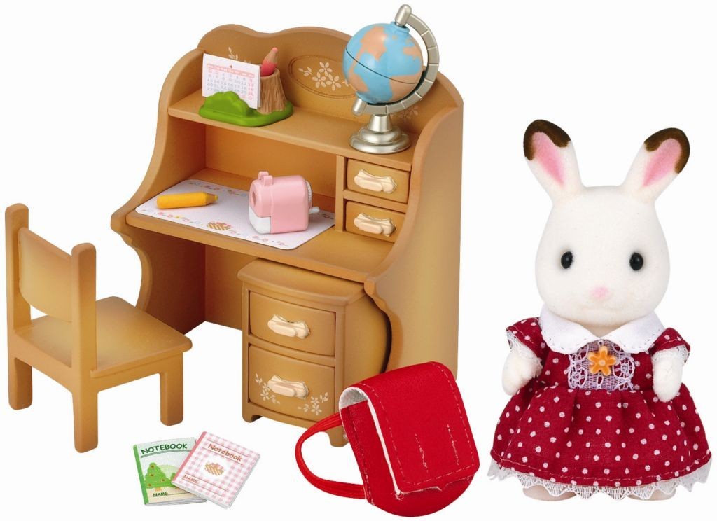 Sestřička už se těší do školy a vše co potřebuje si naloží do své školní aktovky v červené barvě, v jaké jsou i její šatičky. Figurka je vysoká 7 cm a vyrobená z plastu, tělíčko je potaženo jemným semišem. Očička má z černých korálků a oblečení lze opakovaně oblékat a svlékat. Aktovka lze na zádíčka připevnit díky gumičkám. Všechny končetiny jsou ohebné a hlavičkou lze otáčet.7,5 cm vysoký psací stole je vhodný nejen pro malování, psaní úkolů, ale také v něm lze uschovat spoustu věcí do 2 malých a 2 velkých šuplíčků. Všechny šuplíky jsou vytahovací. Na horní poličce pracovního stolu si může umístit svůj globus, a na pracovní desce má vždy po ruce strouhátko na pastelky, které potřebuje každý den. Napřed si ostrouhá pastelky, zkontroluje hodiny a potom už hurá do školy! Sada obsahuje 1 postavičku s aktovkou, velký pracovní stůl (rozměr 7,5 x 7 cm) z plastu, 2 pastelky, stojánek na pastelky, globus, strouhátko na tužky, židličku. Věk: 3+