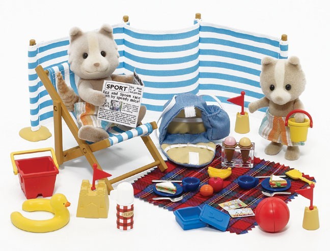 Všechna zvířátka milují moře a na pláži je tolik zábavy! Už stačí jen postavit hrad z písku, tatínek( výška 8,5 cm) si ve svém lehátku přečte noviny a plachta je ochrání před větrem. Malý medvídek( 7,5 cm) si lebedí v písku obklopem svými oblíbenými hračkami. Obě postavičky jsou součástí balení. Oblečeny jsou v plavkách. Na piknikové dece už leží ovoce, toasty talířky příbory, a v termosce je pro osvěžení ledová voda. Lehátko je skládací. Hrníčky, kyblíky a lopatka jsou uloženy společně s balónkem a kruhem do vody vedle tašky. Zástěna proti větru je rozkládácí v kombinaci plast a látka. V chladící tašce jsou zabaleny jen samé dobroty! Pro čtení jsou přiloženy opravdové papírové noviny s informacemi ze sportu a 2 mini pohlednice. Sada obsahuje 2 postavičky a 20 doplňků. Věk:3+