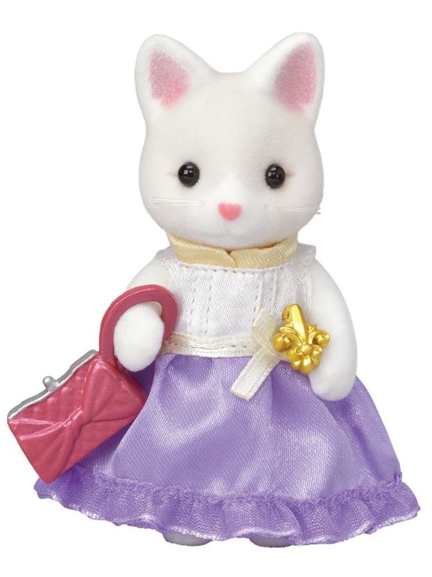 Město - hedvábná kočka ve fialových šatech s kabelkou