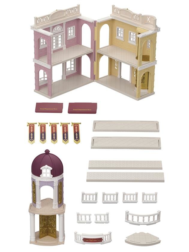 Velký obchodní dům je nádherná městská budova s ozdobnými reliéfy a rytinami. Souprava je vybavena dvoupodlažní budovou obchodního domu a vstupní věží. Hlavní budovu můžete rozevírat a zavírat, abyste si užívali různé tvary. Hlavní budova má ruční výtah, který dokáže vyvézt figurky do horního patra. Okna jsou oddělitelná a lze je nahradit okny z jiných položek řady Town Series. Můžete si vytvořit vlastní městskou část kombinováním tohoto produktu s dalšími budovami v městské řadě, například Delikátní restaurací, Návrhářské Studio a Zmrzlinárna. Můžete také přizpůsobit svou budovu výměnou oken, plotů a markýz, které jsou součástí budovy. Kombinujte s různým nábytkem, obchody a postavami z městské řady pro ještě více zábavy (vše se prodává samostatně).Sada obsahuje:Hlavní budova, vstupní věž, střecha vstupní věže, střešní ozdoba vstupní věže, plot A x4, plot B, plot C, plot D, plot E, plot F, plot G, balkón, uliční deska x2, stropní deska x2 , vlajka x5, markýza x2, okno Ax2, okno Bx2, okenní rám x4 (celkem 34 kusů). Sada neobsahuje figurky. Věk 3+. Video: https://www.youtube.com/watch?v=E3NbZLM2Chs