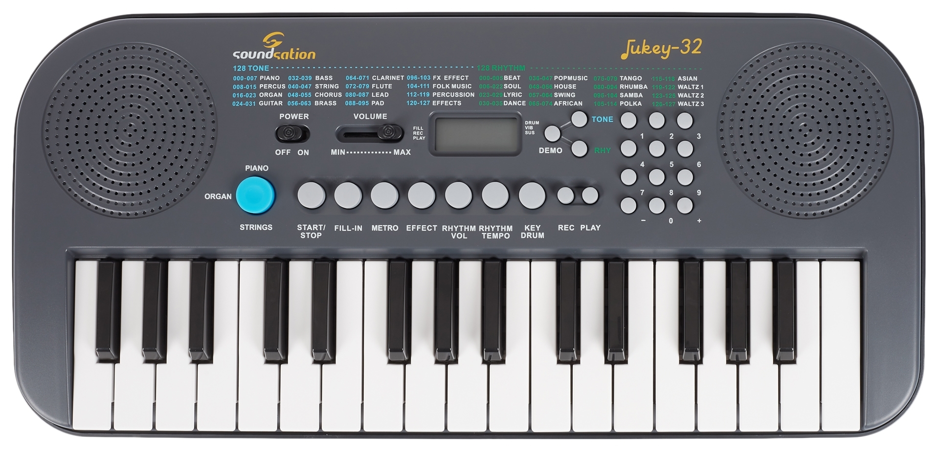 Kompaktní keyboard vhodný pro začínající klavíristy, kteří chtějí mít svůj nástroj stále po ruce a mít možnost trénovat nebo hrát prakticky kdykoli a kdekoli. Nástroj disponuje 32 mini klávesami, integrovaným metronomem, možností nahrávání vlastních skladeb a samozřejmě více jak 128 rytmy, zvuky, nebo 30 demo songy. Výstupní signál potom můžete obohatit o Sustain, nebo Vibrato efekt. Jukey 32 nabízí dva reproduktory o výkonu 0,5 W, lze ale také využít sluchátkový výstup pro silent mód. Klávesy je možné potom napájet prostřednictvím adaptéru (není součástí balení), USB kabelem nebo šesti AA bateriemi (nejsou součástí balení).