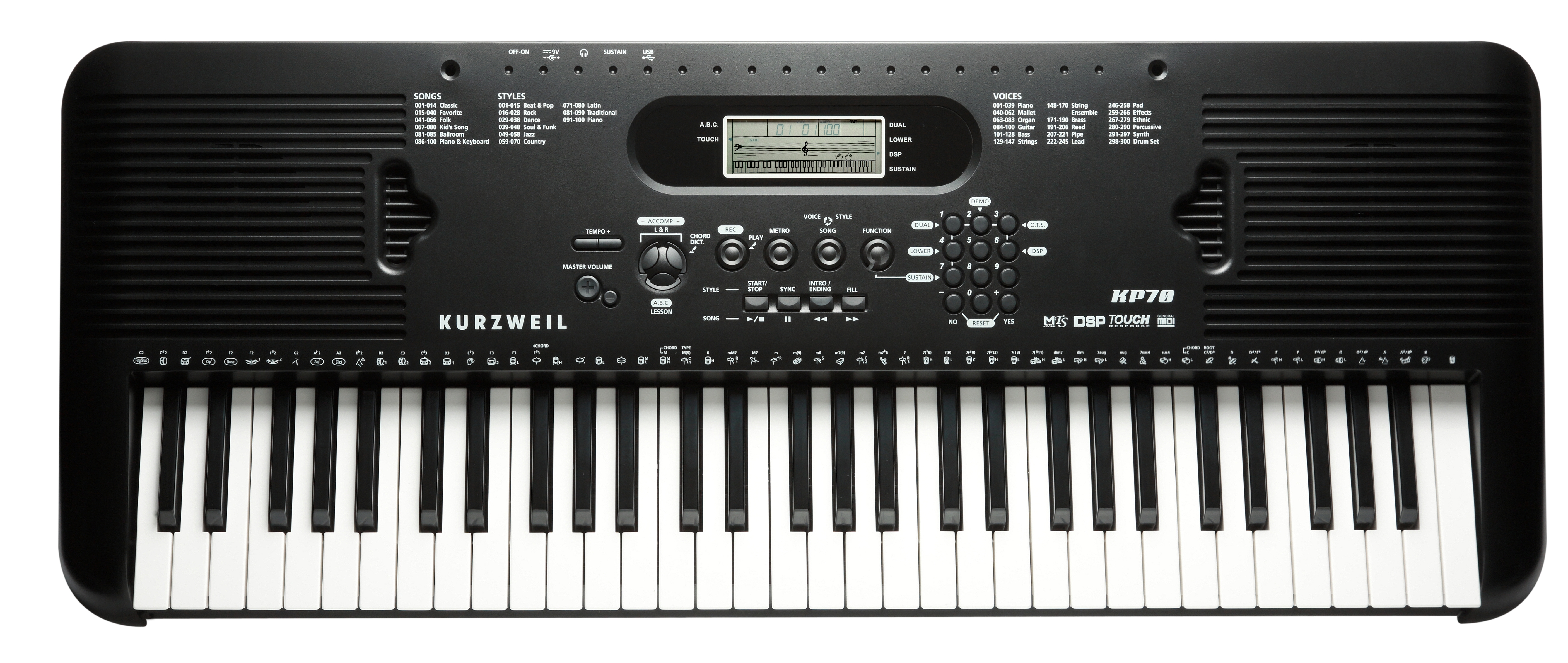 Kurzweil KP70 jsou základním modelem kláves s dynamikou úhozu z produkce značky. Disponují rozsahem pěti oktáv (61 kláves) a nabízí 300 kvalitních presetů, kdy můžete vybírat z široké palety zvuků klávesových (piana, varhany, syntetizéry) strunných (kytary, baskytary, smyčce), dechových (dřevěné, žesťové) a perkusních nástrojů. U zvolených presetů lze dále upravovat citlivost klaviatury (funkce Touch) a její ladění (funkce Transpose a Octave). K určitému standardu patří zpestření hry užitečnými funkcemi a efekty - zde v podobě funkce Dual, Lower Voice/Split a efektů DSP (Reverb, Chorus) a Sustain. Mnozí jistě ocení i výběr ze sta interaktivních automatických doprovodů v různých žánrech (Beat & Pop, Rock, Dance, Soul & Funk, Jazz, Country, Latin, Traditional, Piano). Každý doprovod se skládá z úvodu/intra, hlavního motivu s volitelným rytmickým přechodem (Fill) a ukončení. Akordový charakter doprovodu určíte úderem jedné či dvou kláves (Single Finger), tak i zahráním celého akordu (knihovna akordů KP300X umí rozeznat 31 různých akordů). Samostatné nastavení hlasitosti, tempa a snadné vyvolání nastavených parametrů (funkce One Touch Setting) automatického doprovodu zaručuje, že vaše virtuální doprovodná kapela bude hrát vždy přesně podle vašich představ. Klávesy dále nabízí výukový režim s databází sta skladeb, deset demo skladeb, knihovnu akordů, jednostopý rekordér, kompatibilitu s MIDI přes USB konektor, výstup pro externí sustain pedál (není součástí balení) nebo sluchátkový výstup pro tiché a nerušené cvičení. Nastavení základní hlasitosti, tempa nebo funkce metronomu jsou samozřejmostí. Vše je uloženo ve stylovém šasi se zabudovanými reproduktory o celkovém výkonu 6W. Veškeré ovládací prvky jsou přehledně rozmístěny na předním panelu kláves, o aktuálním nastavení vás bude vždy spolehlivě informovat multifunkční LCD display. K napájení slouží 9V adaptér nebo šest AA baterií. Součástí balení je notový stojánek, který jednoduše připevníte ke klávesám.