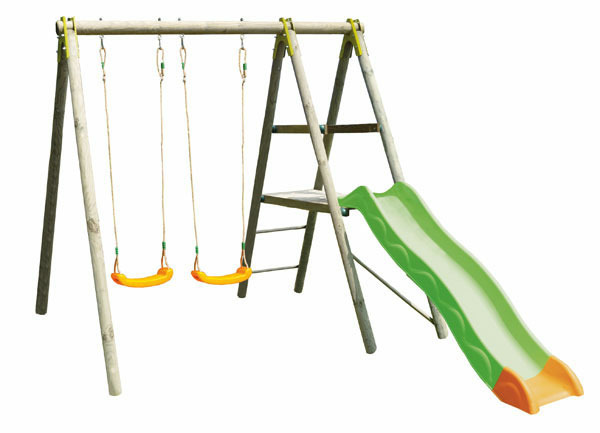 „DANI - celoDŘEVĚNÉ sestavy 230 cm vysoké, materiál harmonizuje se okolní zahradou.Nastavitelná výška plastového sedátka, vyrobené vstřikovací metodou Skluzavka s plošinou Houpačka zavěšena na pevném závěsném oku. Spoje jsou kovové !“