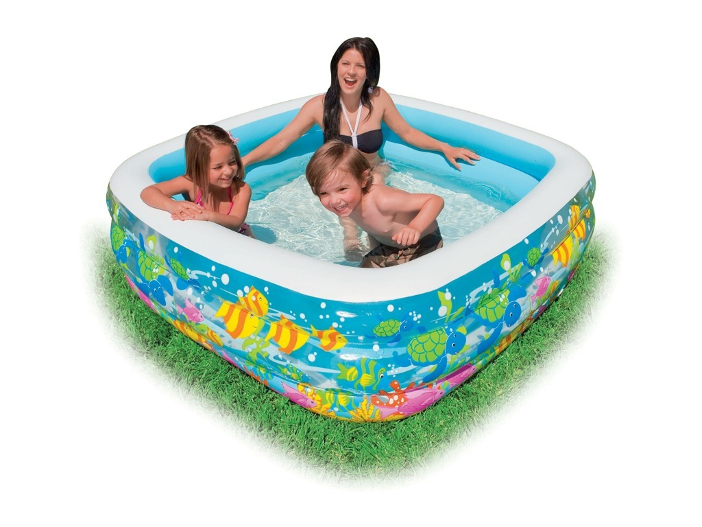 Bazén s motivem mořského dna, hranatý. Přibližná velikost 159×159×50cm. Stěny průhledné s potiskem. Kapacita vody do 36 cm výšky stěny. Opravná sada přiložena.