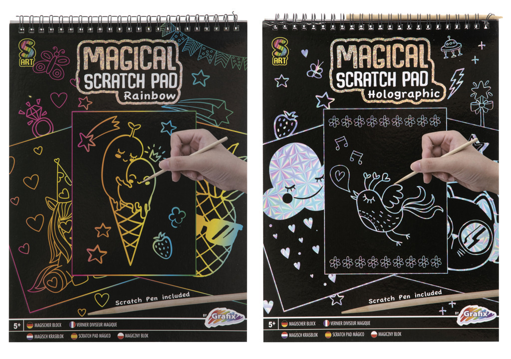 Vyškrabávací obrázky holografické/duhové - blok obsahuje 20 listů s holografickými/duhovými vyškrabávacími obrázky. Rozměr obrázku 21×28 cm.
