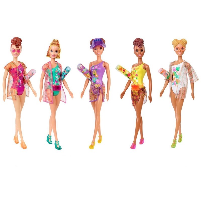 Panenky Barbie color Reveal - 7 překvapení v jednom balení. Začněte tím, že odstraníte vnější vrstvu obalu, odšroubujete horní část tuby a vyndáte zahalenou panenku a čtyři sáčky. Naplňte tubu teplou vodou, vložte panenku dobnitř a nechte vodu až se zabarví fialově. Poté vyndejte panenku a odhalte její vzhled - každá panenka má jinou kombinaci barvy oční, odstínu vlasů , pleti a šatů.
