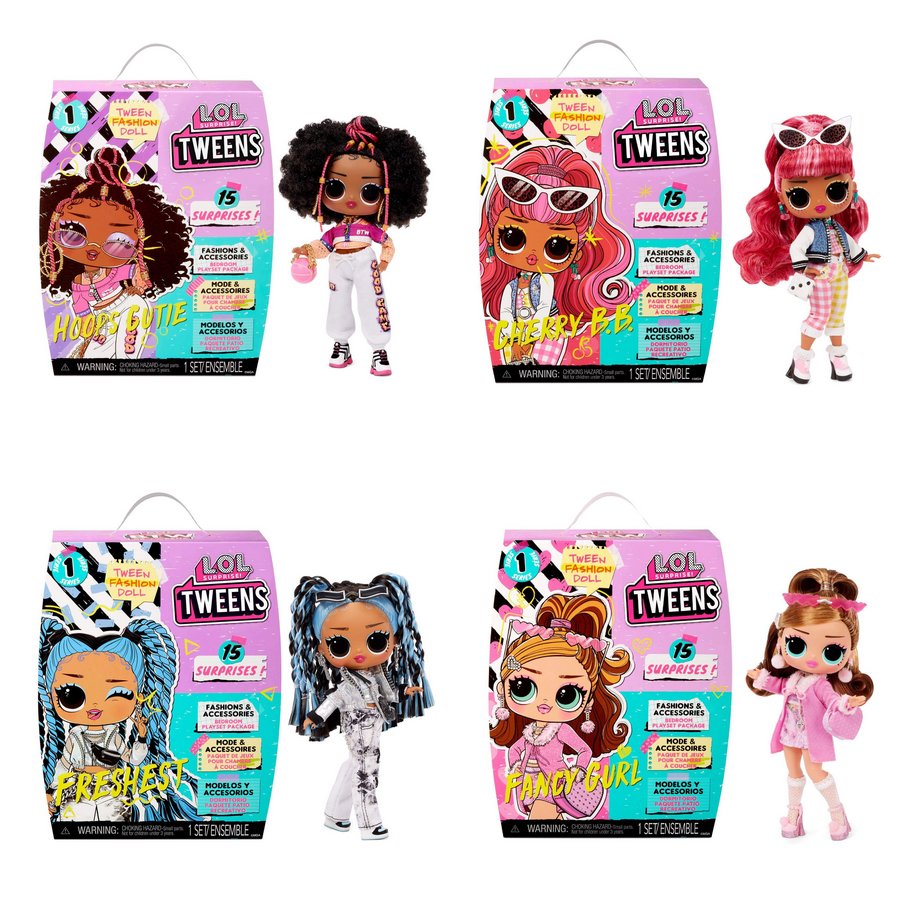 Rozbal úplně novou panenku v L.O.L. Surprise! rodince. Tweens jsou větší ségry L.O.L. panenek a zároveň jsou to menší sestřičky OMG Velkých séger. Rozbal divokou Tweens panenku a 15 překvapení! Balení je možné použít jako pokojíček pro panenky.15 překvapení (náušnice, módní doplňky, kartáč na vlasy, kabelka a spousta dalšího)1 ze 4 nových panenek s ohebnými klouby na nohou a rukou. Varianty panenek - Fancy Gurl,Freshest,Hoops Cutie a Cherry B.B.