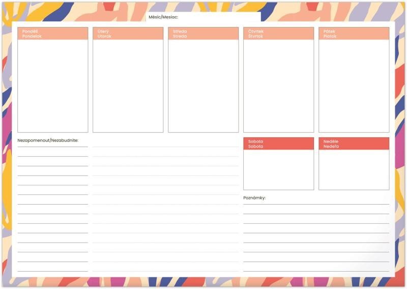 Nedatovaný týdenní organizér s barevným motivem listů. Vedle denního plánovače skýtá samostatný prostor pro poznámky a úkoly. Podložka obsahuje 30 listů.