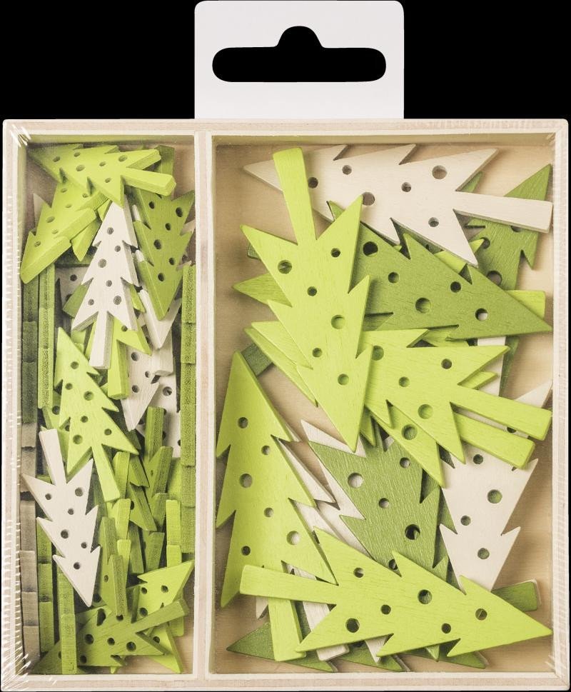 Dřevěné ozdoby vhodné pro dekorační zdobení, výrobu přání, dětskou tvorbu. Baleno v dřevěné krabičce 10,5 x 10,5cm. Barvy: slonová kost, zelená, světle zelená. číst celé