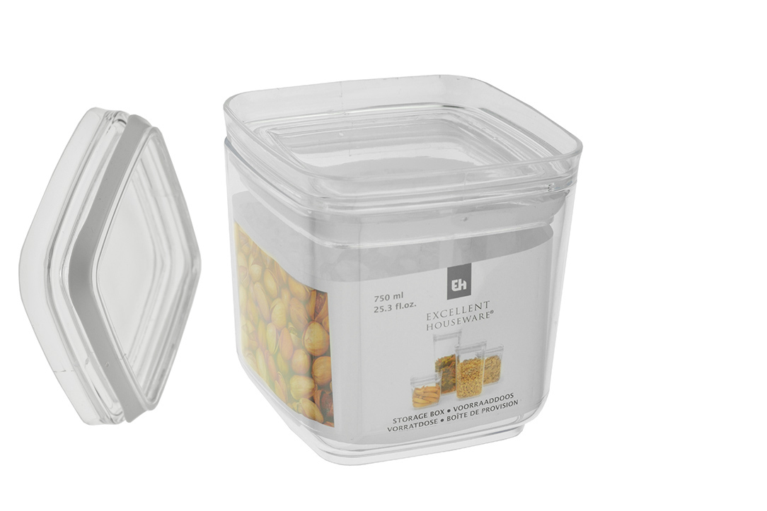Uchovávejte své oblíbené potraviny v tomto praktickém a prostorném úložném boxu na potraviny. Box je vyroben z průhledného plastu a má objem 750 ml a rozměry 10,8 x 10,8 x 9,7 cm. Je ideální na uchovávání oříšků, musli, těstovin, rýže a dalších potravin. Díky pevnému plastovému materiálu a uzavíracímu víčku dokonale uchovává vaše potraviny čerstvé a chrání je před vlhkostí a nečistotami. Tento úložný box je také snadno čistitelný ale není vhodný do myčky na nádobí.
