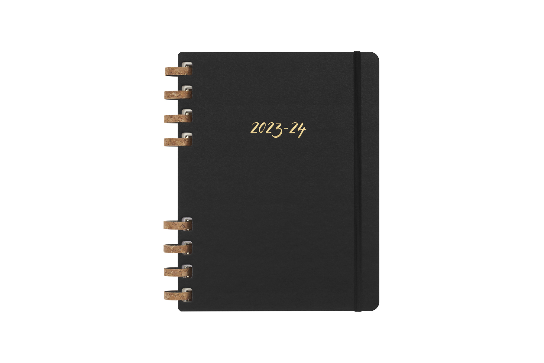 Extra velký černý plánovací zápisník na rok 2023-24. Diář je datovaný od července 2023 do června 2024, má pevnou vazbu vyrobenou z udržitelného papíru od společnosti Favini, předního světového výrobce přírodních materiálů na bázi vláken. Obepíná ho pružná páska proti samovolnému otevírání. První diář na trhu s korkovou spirálovou vazbou. Rozložení diáře: měsíční a týdenní, sekce pro sledování rozvrhů a cílů, sekce pro projekty. Obsahuje praktickou vnitřní kapsu, textilní záložku a barevné samolepky. Papír slonovinové barvy s gramáží 100 g/m2 neobsahuje kyseliny. Tento papír splňuje normy udržitelnosti.