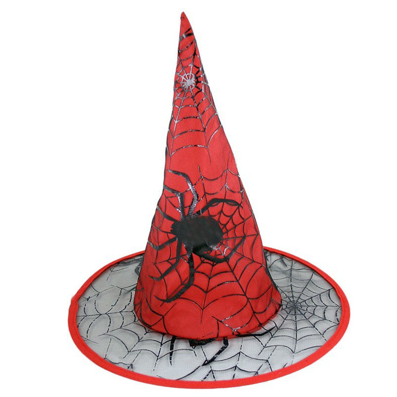 Kouzelný klobouk červené barvy zdoben černými magickými pavučinami a síťkou je určen pro dospělé. Výška klobouku činí 37 cm. Staňte se hvězdou halloweenského večírku díky tomuto nepřehlédnutelnému klobouku a ohromte tak všechny své přátele!