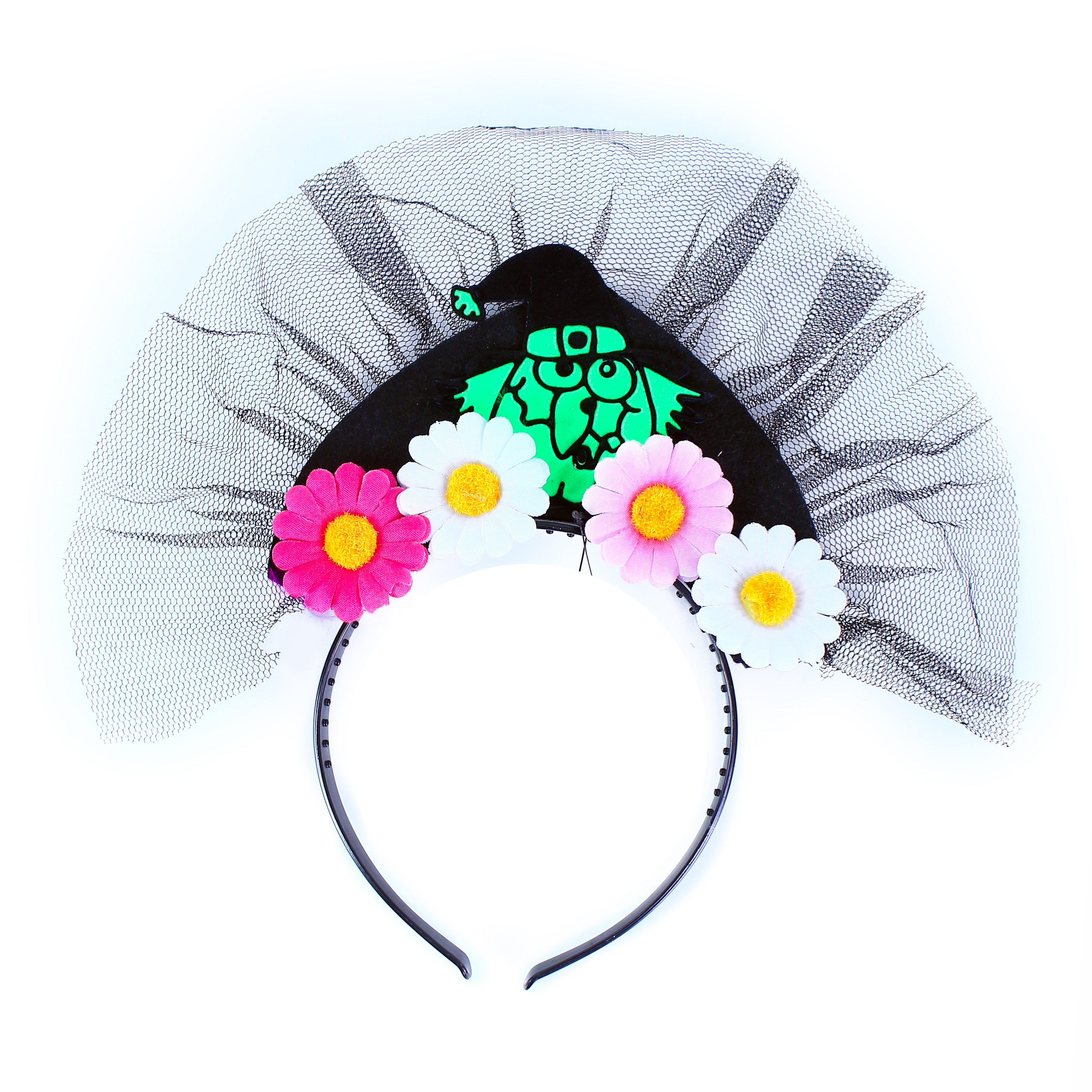 Senzační čelenka s čarodějnicí, zdobená barevnými kvítky. Tato karnevalová vychytávka je perfektním doplňkem na večírek nebo Halloween párty!