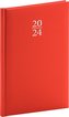 Týdenní diář Capys 2024 v červené barvě. Povrch imitující jemnou strukturu plátna je vhodný pro ražbu přes fólii. Atraktivní barevný odstín doplňuje ražba letopočtu. Týdenní rozvrh s česko-slovenským kalendáriem a doplňkovou angličtinou, němčinou, maďarštinou a ruštinou.