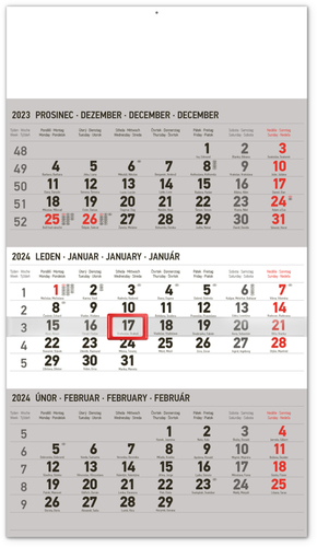 Praktický plánovací kalendář s tříměsíčním rozložením a orientační lištou s posuvným jezdcem. Obsahuje kalendárium s českými jmény a světovými svátky na šedém pozadí. číst celé