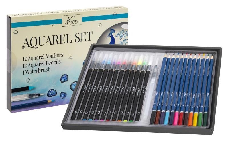 Kreativní sada akvarelových fixů a barviček potěší všechny nadšence akvarelu. Set akvarelových popisovačů Nassau Fine Art s inkoustem na vodní bázi vám vytvoří dokonalý zážitek z každé malby. Marker je vhodný pro začátečníky i pro pokročilejší. Může se aplikovat buď na suchý nebo navlhčený papír. V sadě se nachází také plnitelný štětec na vodu, díky kterému můžete vytvořit jedinečné akvarelové efekty. Kresby vytvořené akvarelovými barvičkami lze míchat s vodou, čímž dosáhneme nádherné akvarelové malby. kreativní akvarelová sada obsahuje 12 x akvarelové fixy 12 x akvarelové barvičky 1 x štětec na vodu se zásobníkem pro začátečníky i pokročilé
