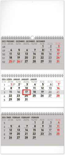 Praktický tříměsíční kalendář s plochou pro potisk a náhledem tří měsíců současně můžete díky dvojité spirále pohodlně složit do obálky velikosti A4. Kalendárium obsahuje česká jména a světové svátky. Díky volné ploše pro potisk se může stát zcela originálním předmětem pro firmy.
