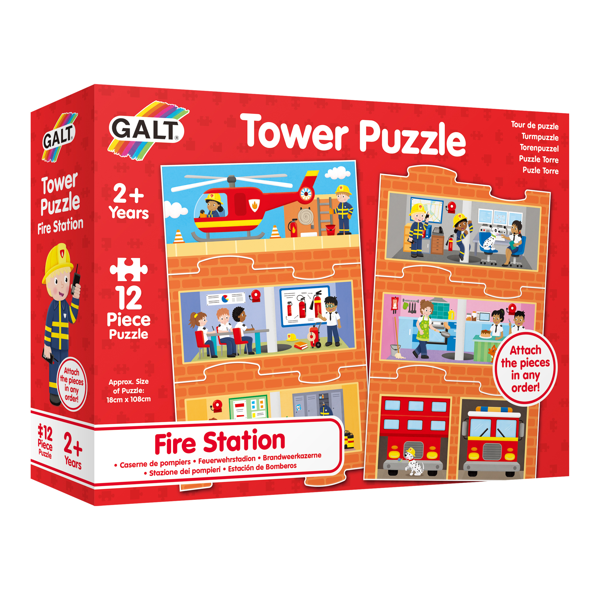 Kreativní puzzle požární stanice skládané do tvaru věže.
