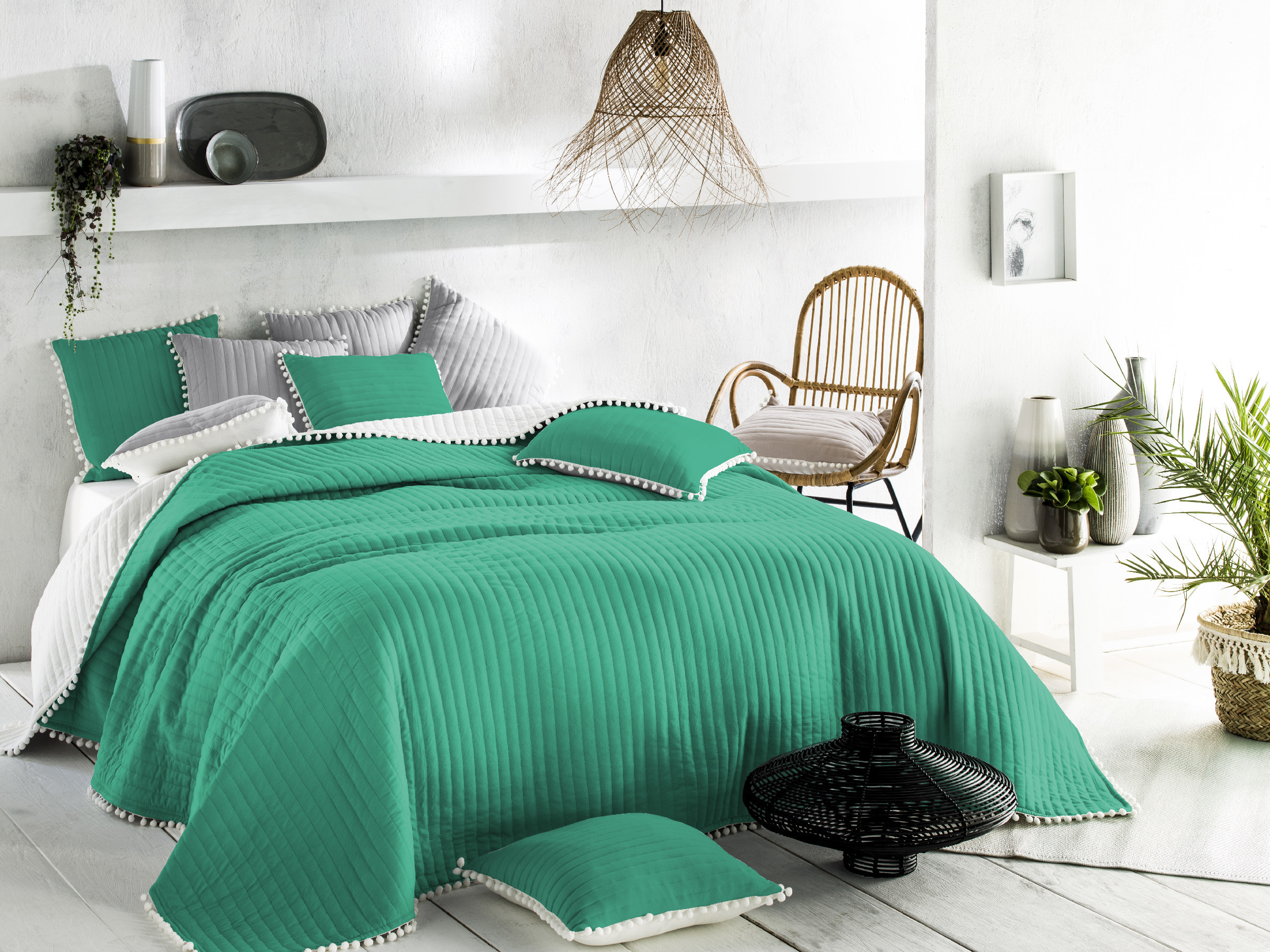Kvalitní originální přehoz na postel v trendovým barvách s aplikacemi kuliček na dvoulůžko o rozměru 220x240 cm.