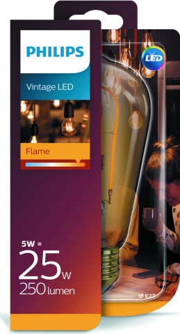 LED žárovka Philips řady Vintage s paticí E27 a tvarem baňky ST64 má stylový retro vzhled ve zlatavém provedení s hřejivým bílým světlem připomínajícím barvu plamenu svíčky s teplotou chromatičnosti 2000K. Navodí tak velmi příjemnou atmosféru v interiéru pro odpočinek a relaxaci. Navíc díky technologii EyeComfort šetří vaše oči. Její příkon je 5 W a nahrazuje svit klasické žárovky s maximálním příkonem 25 W. Dokáže uspořit až 80 % elektrické energie, její životnost je až 15.000 hodin při až 20.000 spínacích cyklech. Žárovku není možné stmívat.