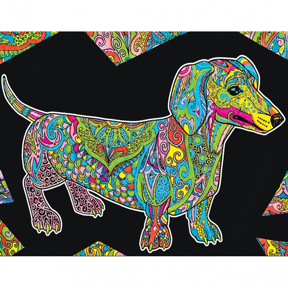 Sametový obrázek k vybarvení, motiv Jezevčík. Vybarvovací šablona je ze sametu, který usnadňuje vybarvení. Obrázek můžete vybarvit fixami, pastelkami nebo voskovkami. Okraje motivu jsou přesně vymezeny sametem a zabraňují přetahování okrajů.Obrázek je možné vybarvit dle přiloženého motivu nebo můžete popustit uzdu své fantazii.Velikost: S 21 x 29,7cm.Vhodné pro děti od 3 let.