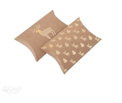 Pudełka składane typu pillow box ze złotym patternem w jelonki i choinki sprawdzą się świetnie jako opakowania na prezenty świąteczne. Można schować do nich m.in. vouchery podarunkowe, biżuterię i inne, drobne upominki. Te tekturowe pudełka nadają się do dodatkowego zdobienia np. wstążeczkami, cekinami, elementami florystycznymi lub naklejkami Pudełeczka są do samodzielnego złożenia.