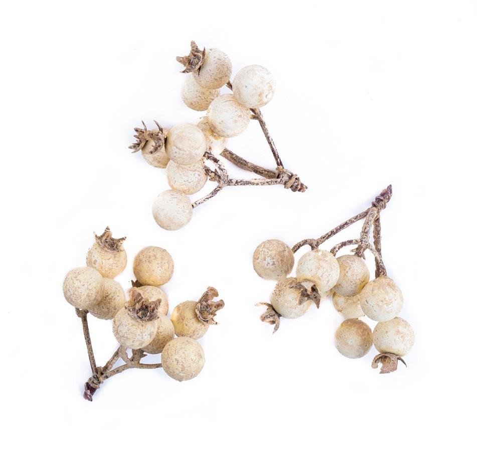 Drobne gałązki z jasnymi jagodami do złudzenia przypominające naturalne. Wykonane z dużą dokładnością i utrzymane w kremowej kolorystyce z licznymi nieregularnościami i przebarwieniami.