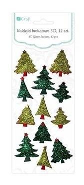 Brokatowe naklejki z motywem choinek - złote i zielone.