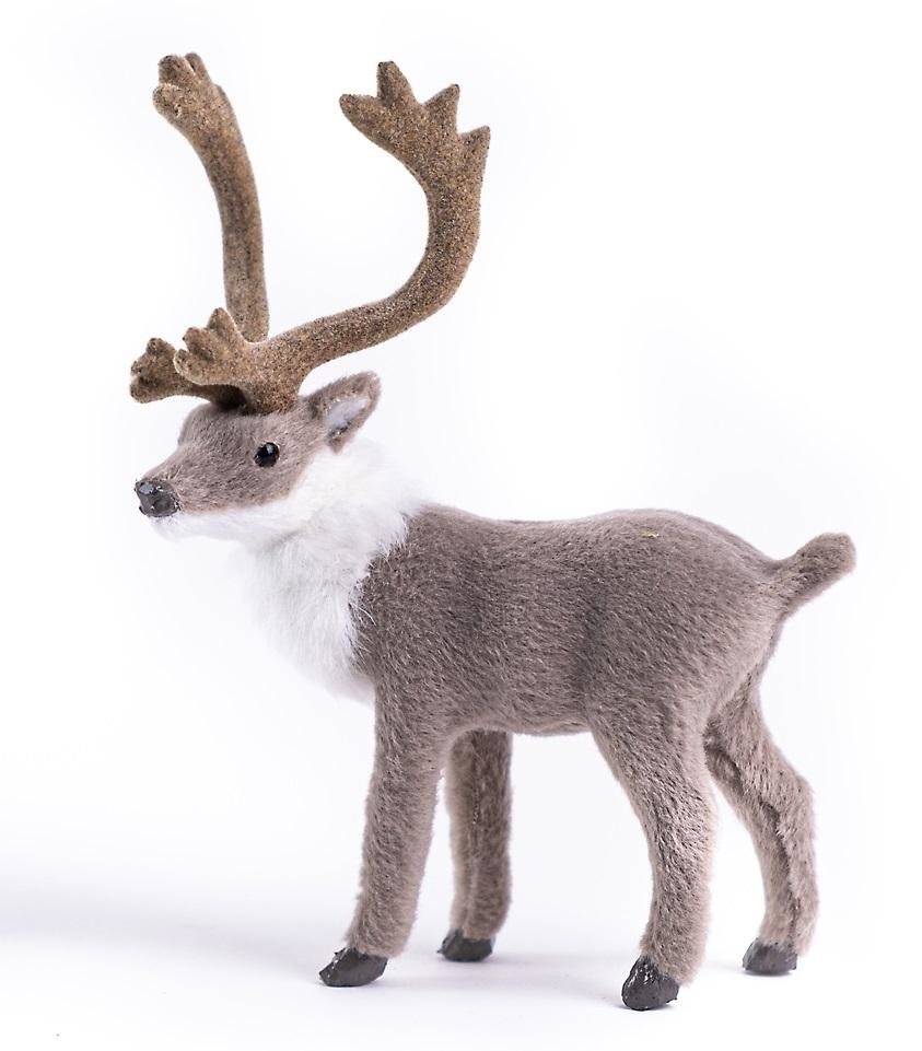 Dekoracyjna figurka renifera pokryta miękkim futerkiem w kolorze szarym i białym.