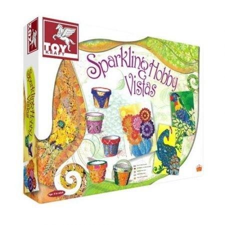 MIENIĄCE HOBBY Zestaw zawiera: ceramiczne doniczki:6, brokat w saszetkach ( złoty i srebrny):2, klej:1, karty graficzne:4, piasek w saszetkach:8 kolorów, cekiny w saszetkach:6 kolorów, brokatowy klej:2, pędzelek, szpatułka, lejek, instrukcję. BŁYSZCZĄCE DONICZKI Używając kolorowego piasku, kolorowych cekinów, brokatu i kleju zamień ceramiczne doniczki w mieniące arcydzieło. Wymyśl własny projekt lub wzoruj się zdjęciami na opakowaniu. OBRAZKI ZDOBIONE CEKINAMI I PIASKIEM Dołączone karty graficzne przedstawiają pawia, bukiet kwiatów i papugę. Wszystkie trzy prace możesz zamienić w błyszczące arcydzieła używając kleju, piasku, cekinów i brokatu. WIEK 8+