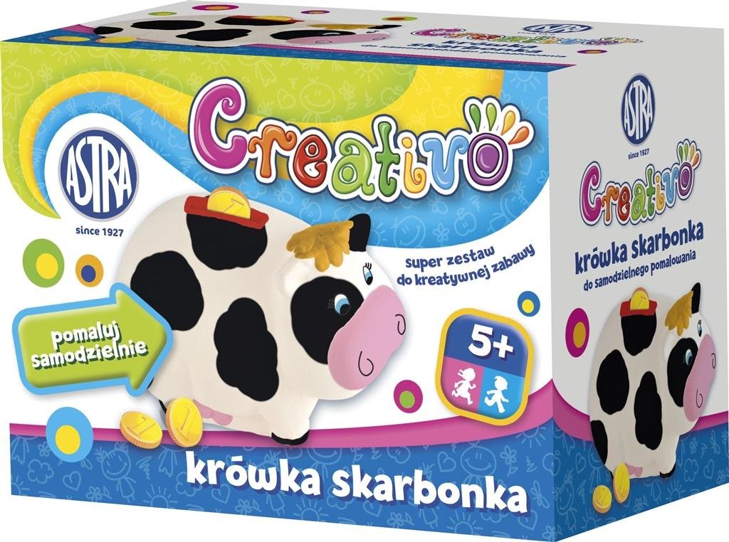 Zestaw Skarbonka malowanka Krówka zawiera: - 6 kolorów farby akrylowej 3 ml - plastikowy pędzelek - gipsowa skarbonka w kształcie Krówki Creativo jest to seria produktów służąca do rozwoju kreatywnego myślenia i zdolności manualnych dzieci. Zestawy Creativo to szereg produktów o różnym stopniu trudności. W serii znajdują się farby do malowania palcami dla najmłodszych, zestawy doniczek do ozdobienia, skarbonki, buteleczki, koło garncarskie i inne.