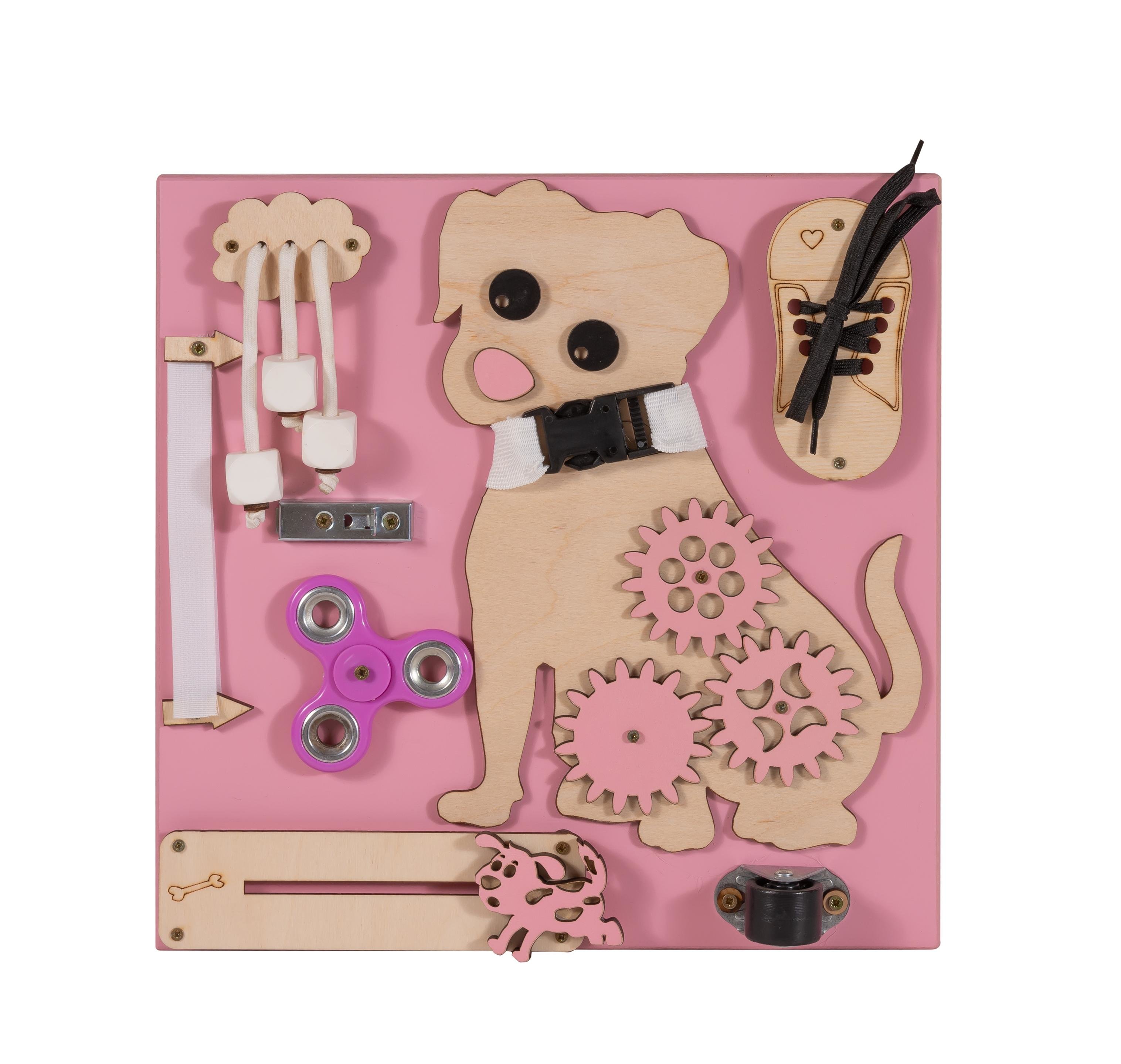 Tablica manipulacyjna Pies Hugo Różowa Wyposażenie: • ruchome kółka zębate • koraliki zwisające z chumury • but ze sznurówką (nauka sznurowania) • pies z obrożą (nauka zapinania) • rzep • zasuwka • spiner • ruchome kółko do mebli • ścieżka z ruchomym pieskiem Wymiary: 30 x 30 x 6,5 cm