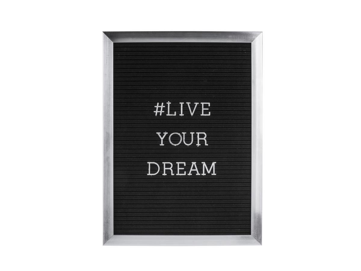 Závěsná tabule ve stříbrném rámu s chromovými písmenkami.