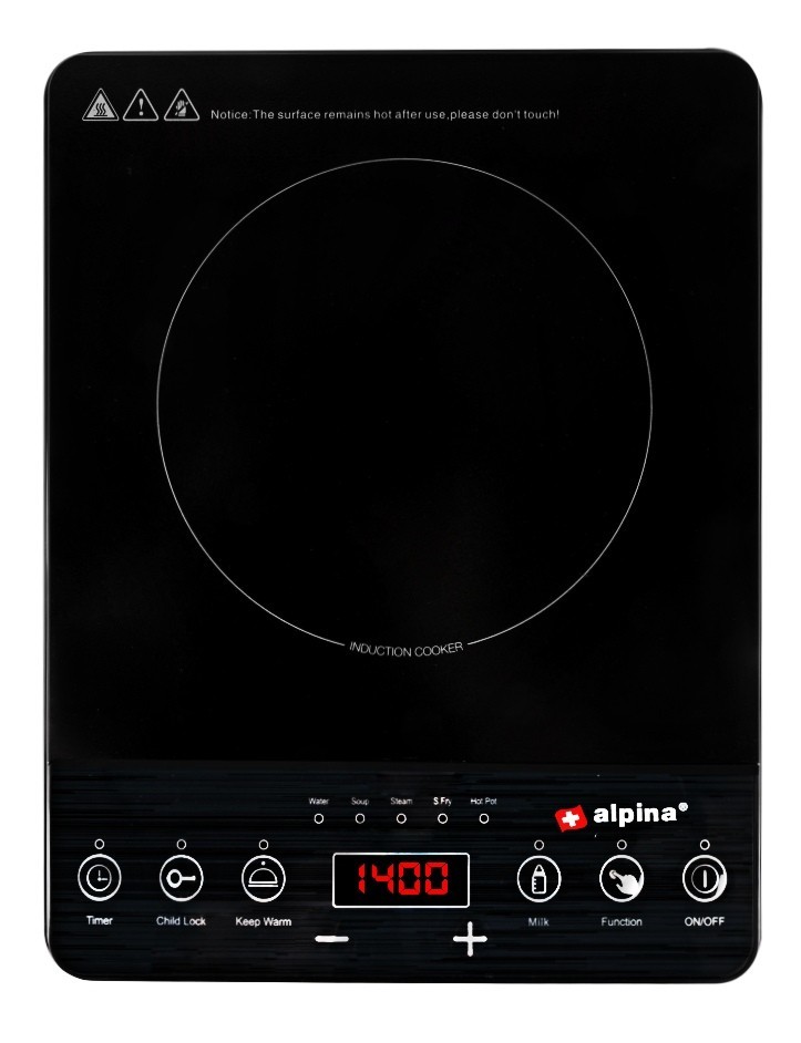 Vaření kdekoli a kdykoli chcete: Tato indukční varná deska s 1 plameny od Alpina je lehká a malá a lze ji vzít všude s sebou. Například na dovolené! Černou, skleněnou desku můžete ovládat jednoduše pomocí tlačítek a 4místného displeje. Můžete si tak vybrat z 10 stupňů, které vám umožňují regulaci 60 až 240 stupňů Celsia. Indukční varná deska Alpina také dělá váš domov mnohem bezpečnějším. Dětská pojistka zajišťuje, že se vaše děti neočekávaně neporaní a ochrana proti přehřátí a automatické vypnutí riskují z vaření. Bezpečné vaření ještě nikdy nebylo tak zábavné a bylo tak snadné!