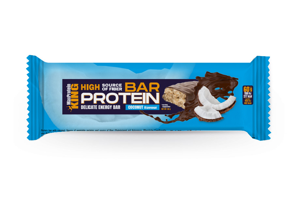Složení proteinové tyčinky MaxProtein King: glukozový sirup, ovesné vločky, 17% mléčná čokoláda (cukr, kakaové máslo, sušené plnotučné mléko, kakaová hmota, kakaový prášek se sníženým obsahem tuku, emulgátor: sojový lecitin, E 476, vanilkový extrakt),8,3% sušený kokos, tuk ( bambucký, palmový v různém poměru), 7% sojový protein izolát, sojové vločky, zvlhčovadlo: glycerin , křupka kakaová ( rýže, pšeničná mouka, cukr, kakaový prášek 6%, monohydrát palmového oleje), aroma, emulgátor: slunečnicový lecitin, regulátor kyselosti: kyselina citronová, sůl.