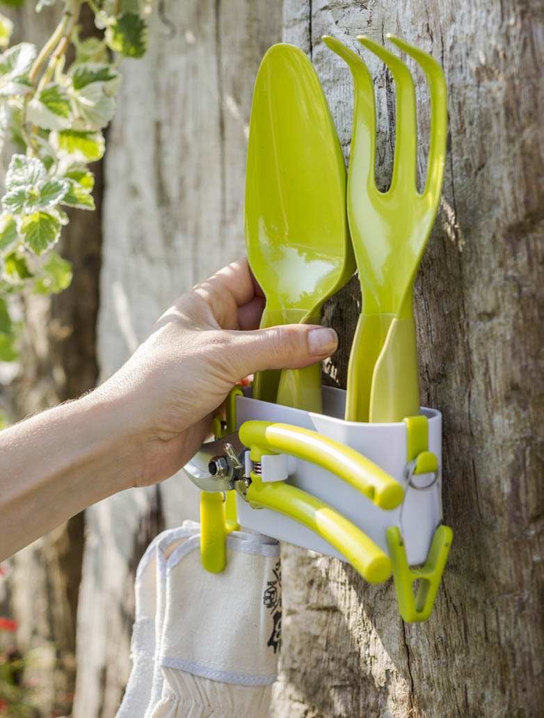 I na zahradě můžete mít svůj styl! Zahradní set Green collection v praktickém držáku, který lze kdekoliv zavěsit má zajímavý design a obsahuje nejdůležitější nástroje: lopatku, kypřící hrabičky a nůžky k řezu, svorky a háčky pro uložení dalších věcí (provázky, rukavice...).