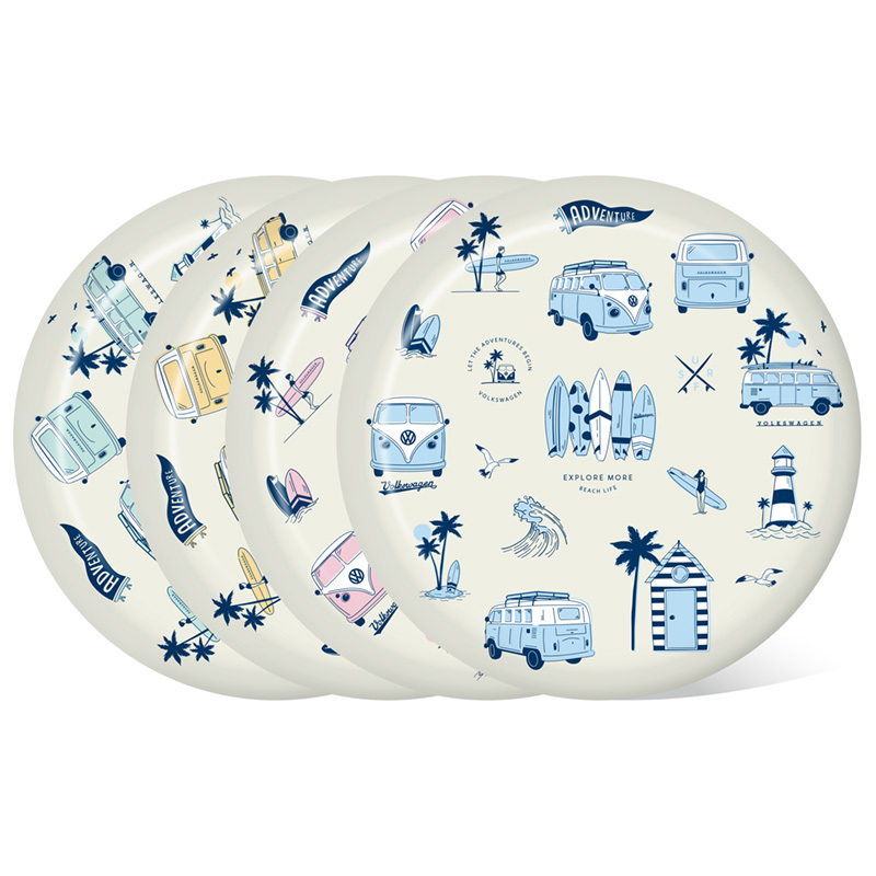 Sada 4 znovupoužitelných piknikových talířů z recyklovaných plastových lahví RPET - VW Volkswagen T1 karavan, Nová dobrodružství
