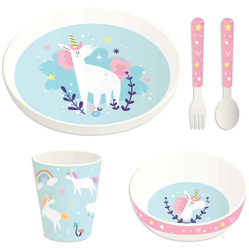 Znovupoužitelná dětská sada nádobí 5 kusů z recyklovaných plastových lahví RPET hrnek, miska, talíř a příbor - Kouzelný jednorožec