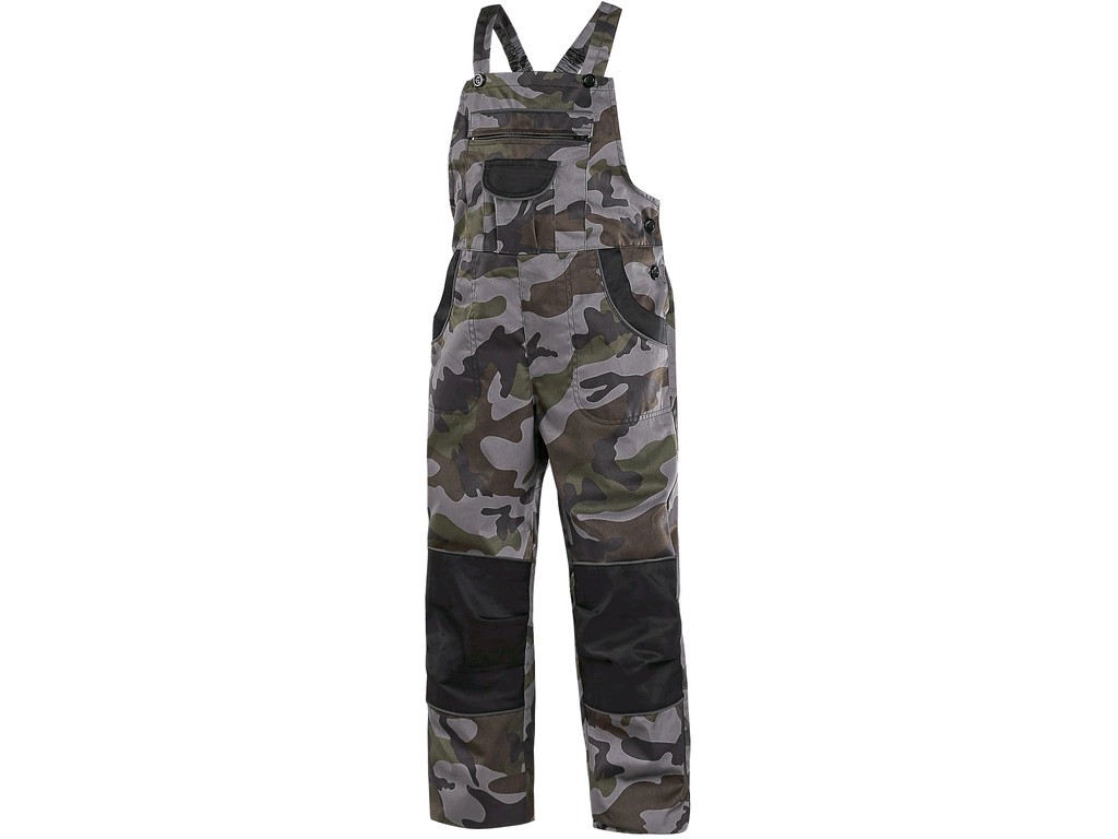Dětské maskáčové kalhoty s náprsenkou, vybaveny zesílenými koleny a sedem pro delší životnost. Pas na knoflíky, vzadu do gumy, šle s gumou vzadu, náprsní kapsa na zip s menší kapsou, přední i zadní kapsy, boční kapsa, reflexní doplňky.