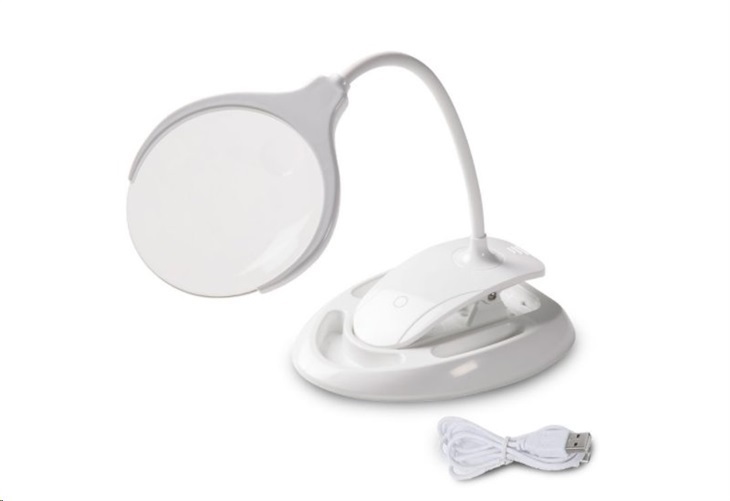 Zvětšovací sklo 3X / 8X:6 LED úsporná lampa s nastavitelnou úrovní jasu pomocí „dotykového“ spínače. Dlouhý dotyk vám místo toho umožní zvolit požadovanou úroveň jasu. Použitelné také jako stolní lampa.Dobíjecí baterie 400 mAh (součástí balení je nabíjecí kabel Micro USB).