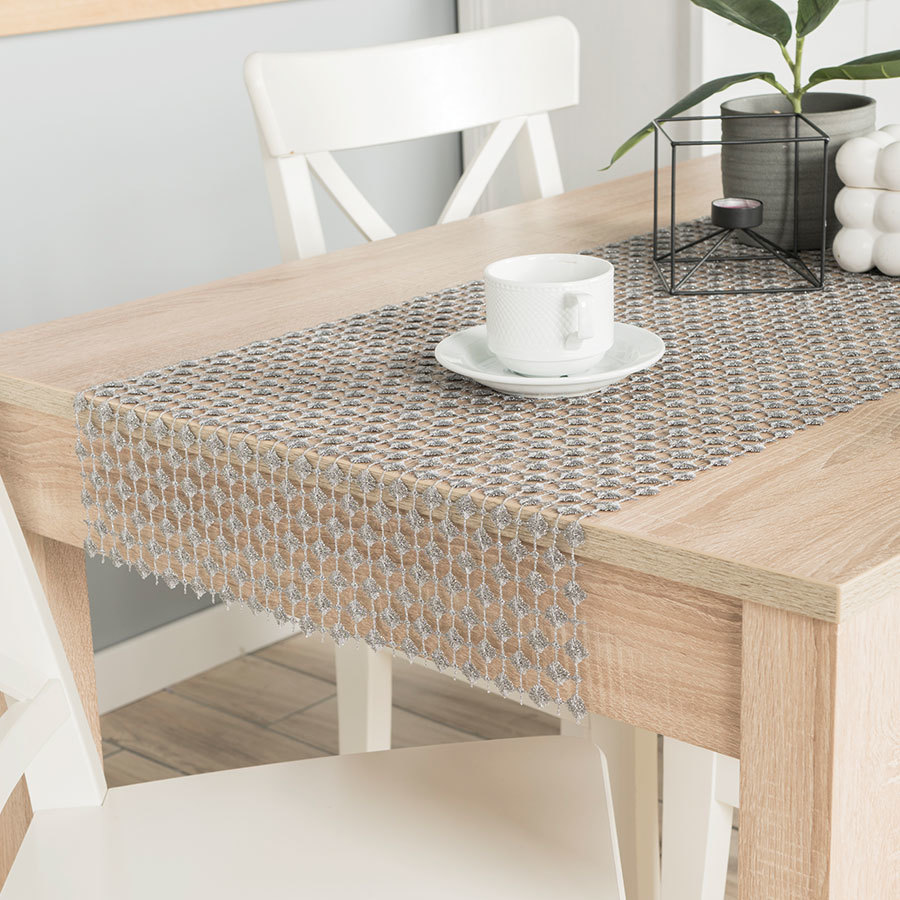 Kvalitní žakárový běhoun na stůl v moderním designu. Běhoun je nabízen ve velikosti 40x140 cm. Běhoun je odolný vůči nečistotám, neabsorbuje vodu. Běhoun je všestranným a stylovým doplňkem Vaší jídelny.  Krajkový běhoun je s lurexem. číst celé