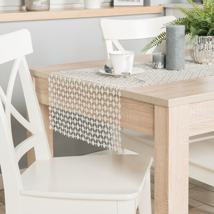 Kvalitní žakárový běhoun na stůl v moderním designu. Běhoun je nabízen ve velikosti 40x140 cm. Běhoun je odolný vůči nečistotám, neabsorbuje vodu. Běhoun je všestranným a stylovým doplňkem Vaší jídelny. Krajkový běhoun je s lurexem.