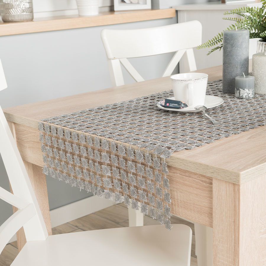 Kvalitní žakárový běhoun na stůl v moderním designu. Běhoun je nabízen ve velikosti 40x140 cm. Běhoun je odolný vůči nečistotám, neabsorbuje vodu. Běhoun je všestranným a stylovým doplňkem Vaší jídelny.  Krajkový běhoun je s lurexem. číst celé