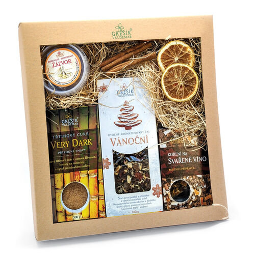 Kazeta obsahuje: Kandovaný zázvor 50 g, Koření na svařené víno 50 g, Třtinový cukr Very Dark přírodní tmavý 300 g, Vánoční ovocný čaj 100 g